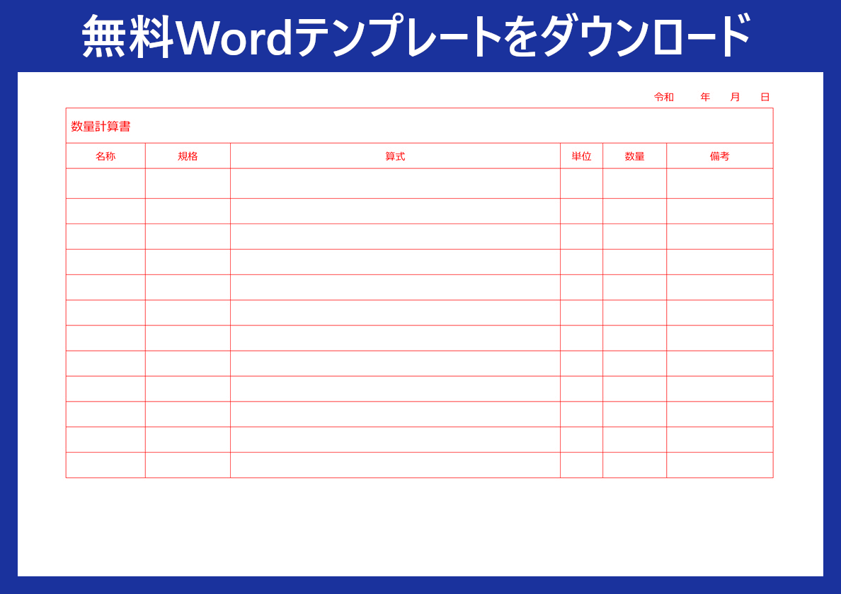 業務の効率と精度を高めるためにも、数量計算書は分かりやすい様式で整えることが重要です。Wordテンプレート無料ダウンロードし、実務に役立つ正確な書類作成に活用してみてください。