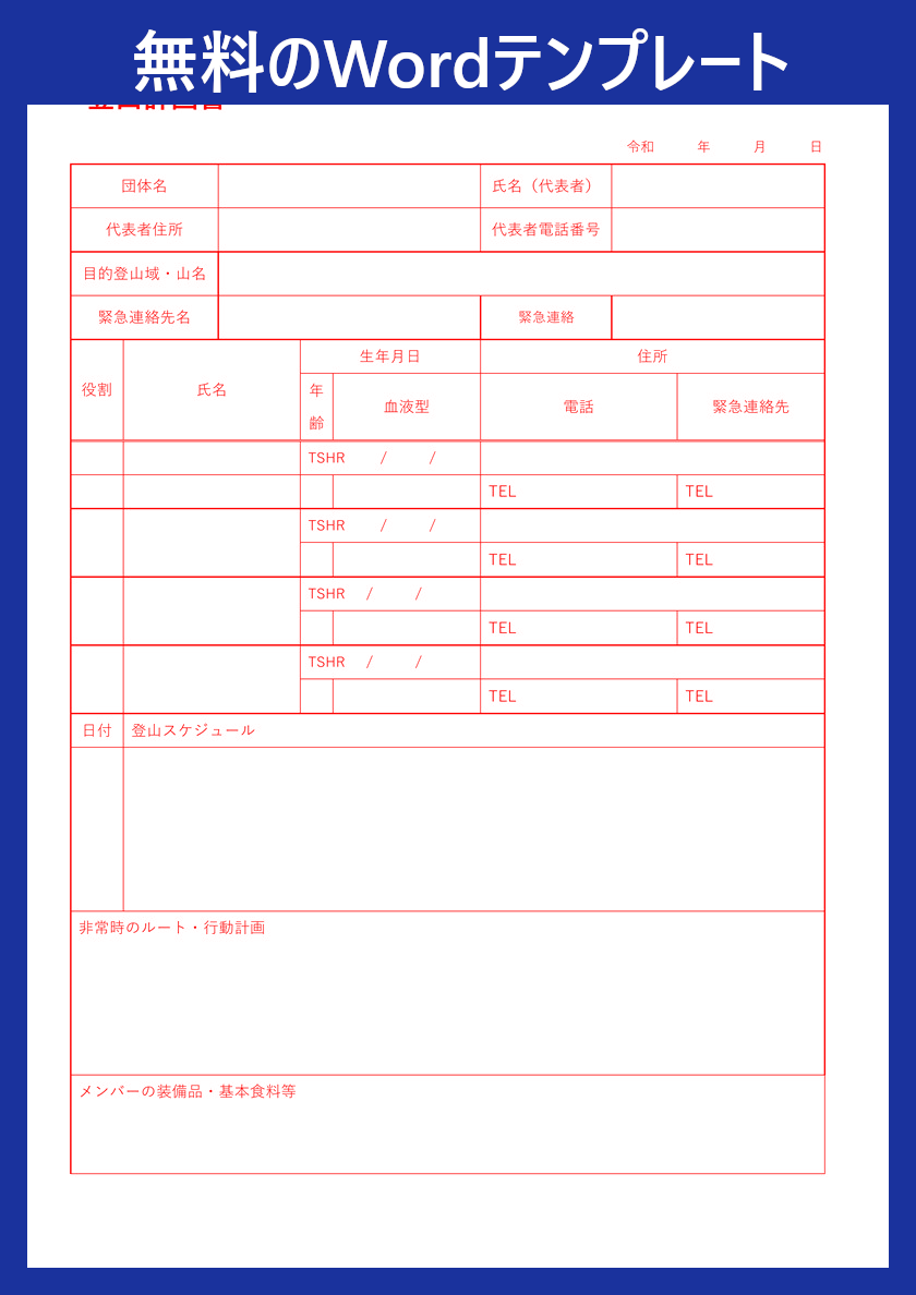 効率よく書類を整えるには、Wordで使える登山計画書テンプレートの活用が便利です。あらかじめ必要項目が整理されたフォーマットにより、ルートや時間、連絡先などを分かりやすく記入できます。