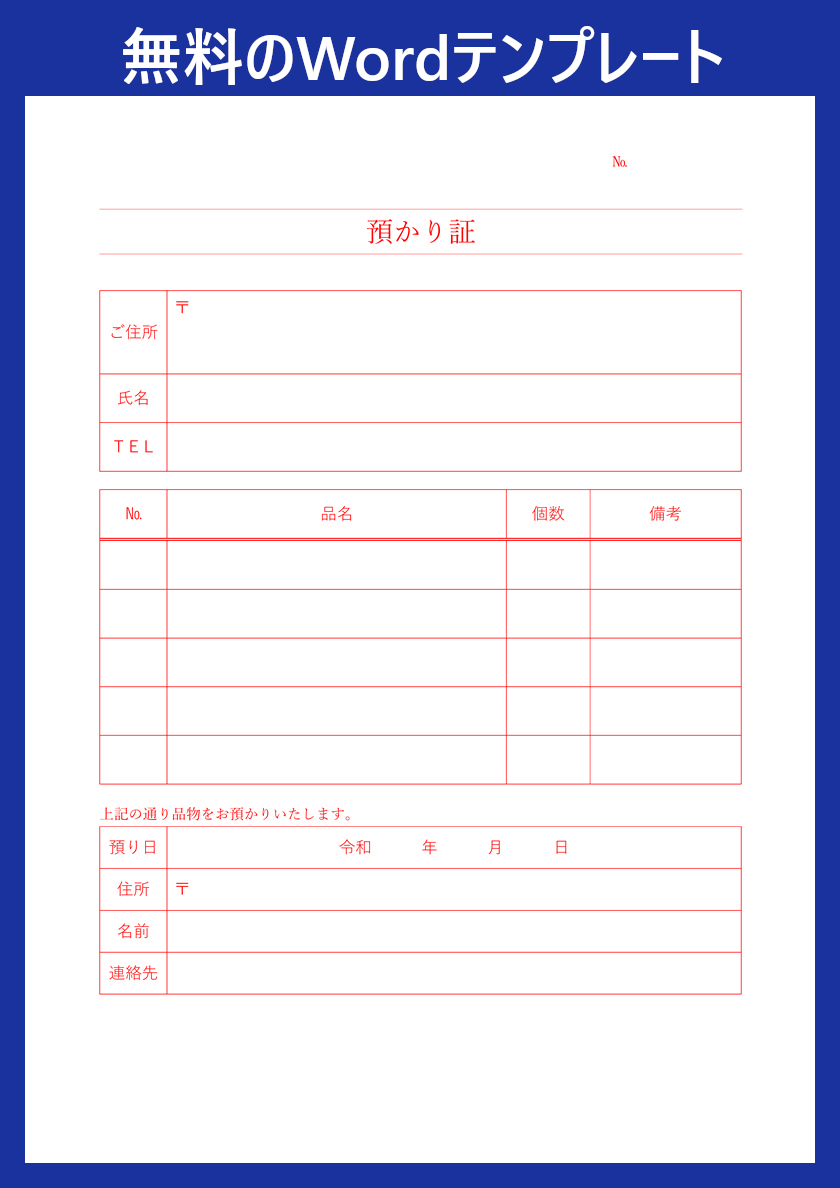効率よく作成するには、Wordで使える預かり証テンプレートの活用が便利です。あらかじめ必要な項目が整理されているため、預かり内容や数量、目的、返却予定などを分かりやすく記録できます。