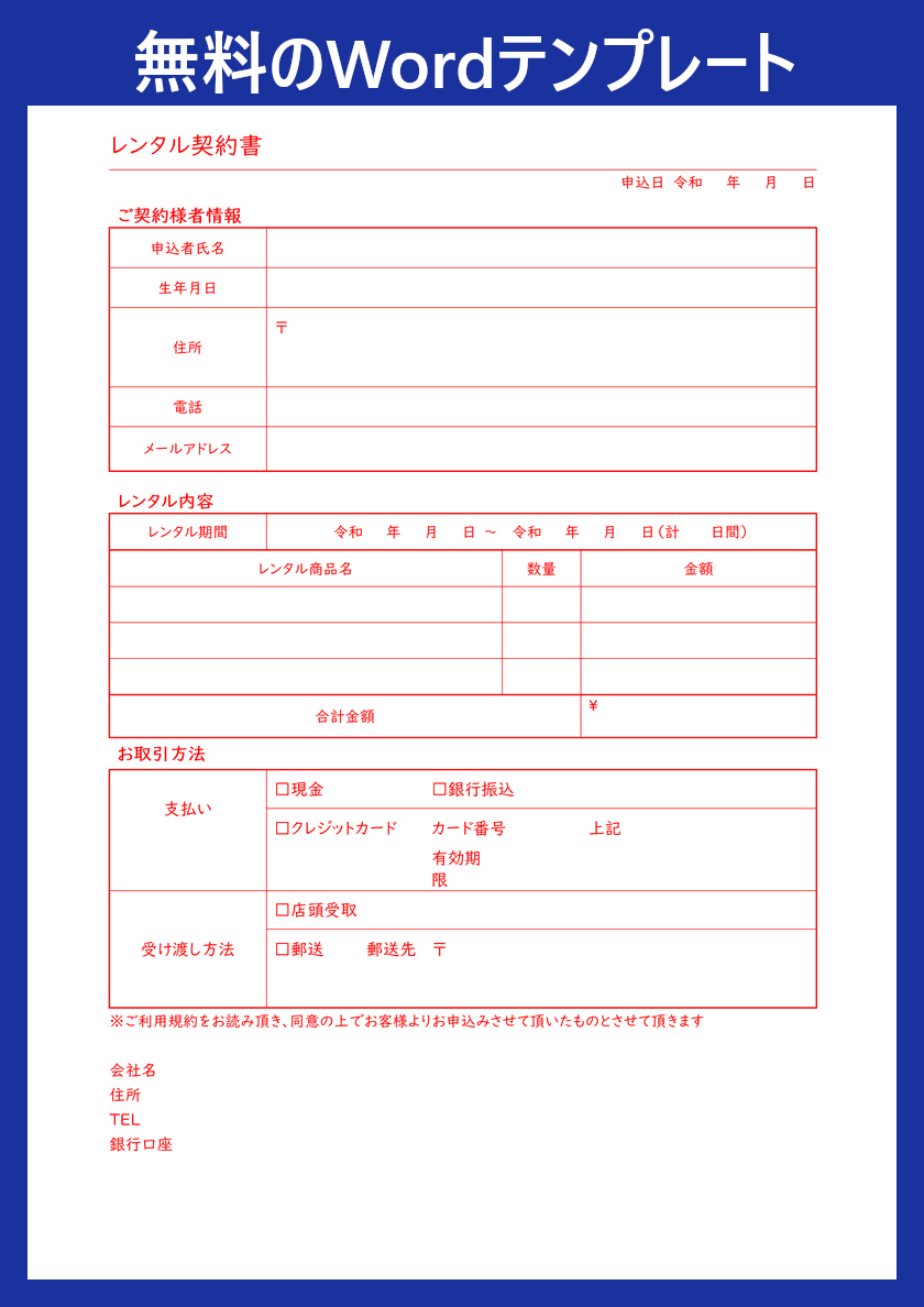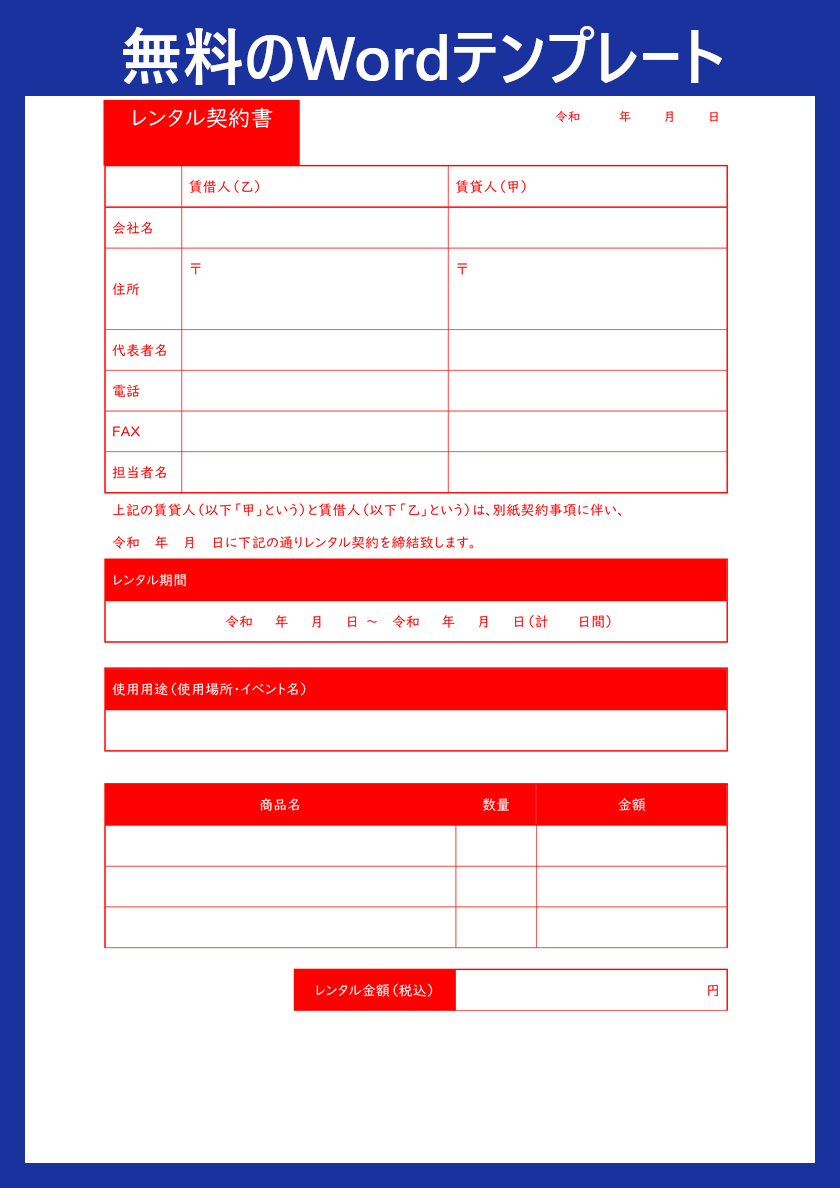 まずは便利なレンタル契約書テンプレートを無料ダウンロードして、必要事項を入力するだけで契約書を作成してみてください。
