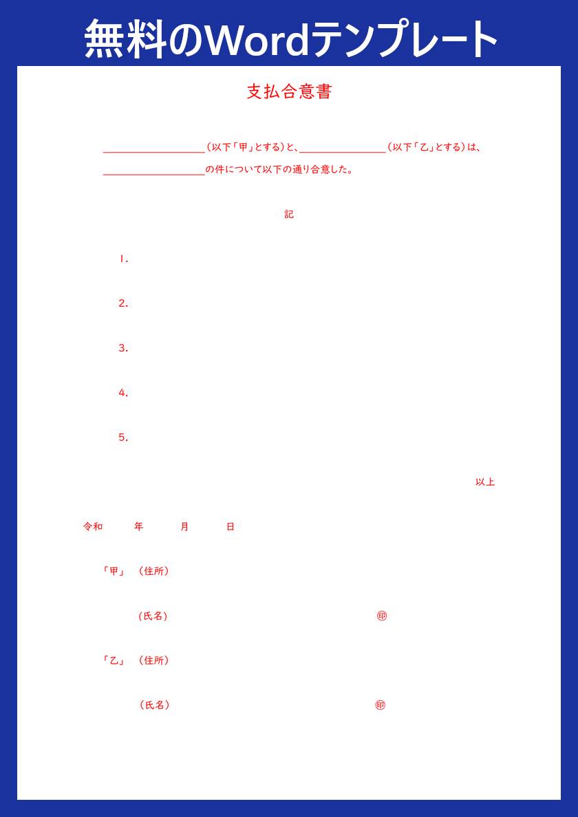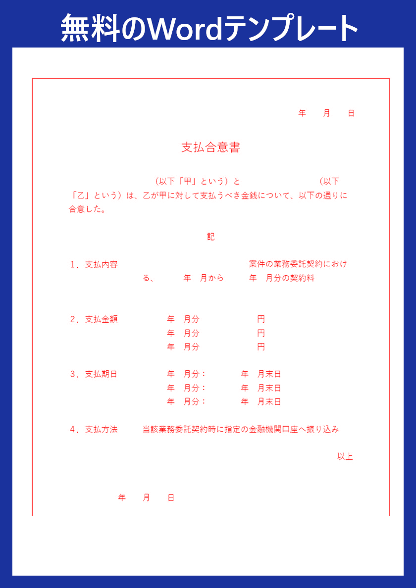 書類をきちんと残しておくことで、双方が納得した内容を明確にし、安心して取引を進めることにつながります。一から書類を作る必要はなく、便利なWordテンプレートを活用することで、効率よく支払合意書を準備することができます。