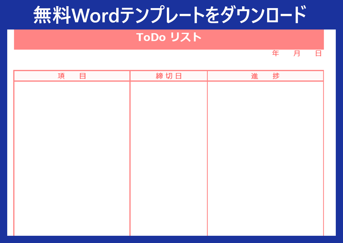まずは便利なWordテンプレートを無料ダウンロードして、毎日のタスク管理に活用してみてください。見やすく整理されたToDoリストを使うことで、仕事や勉強、家庭の予定まで幅広く管理することができます。